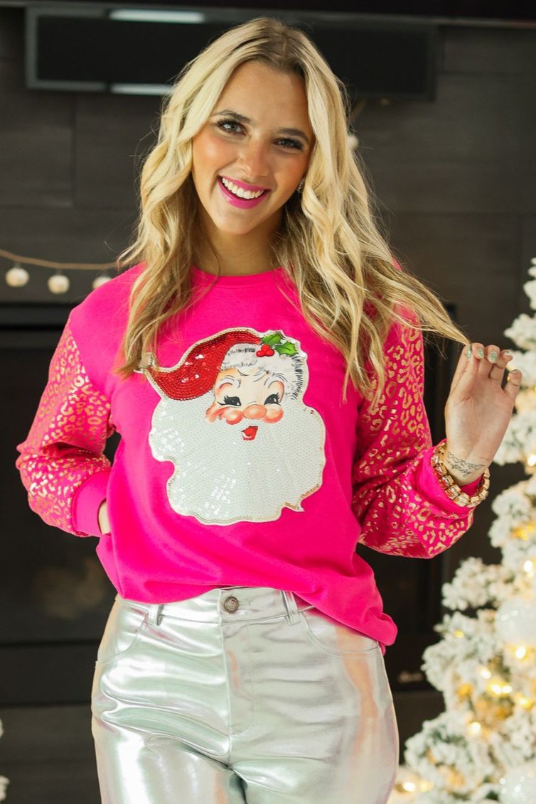 Santa on Pink Sweatshirt with Sequin Sleeves