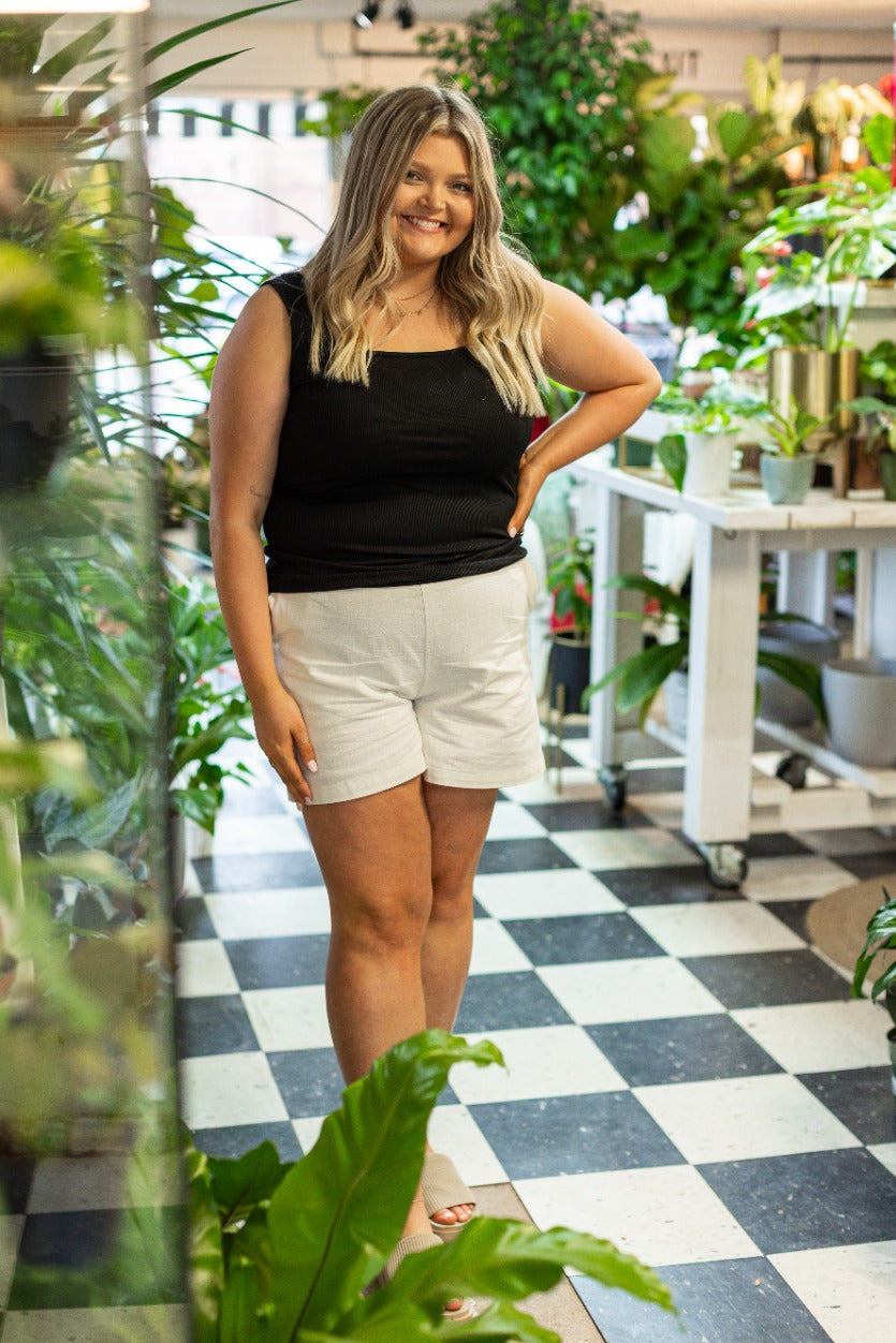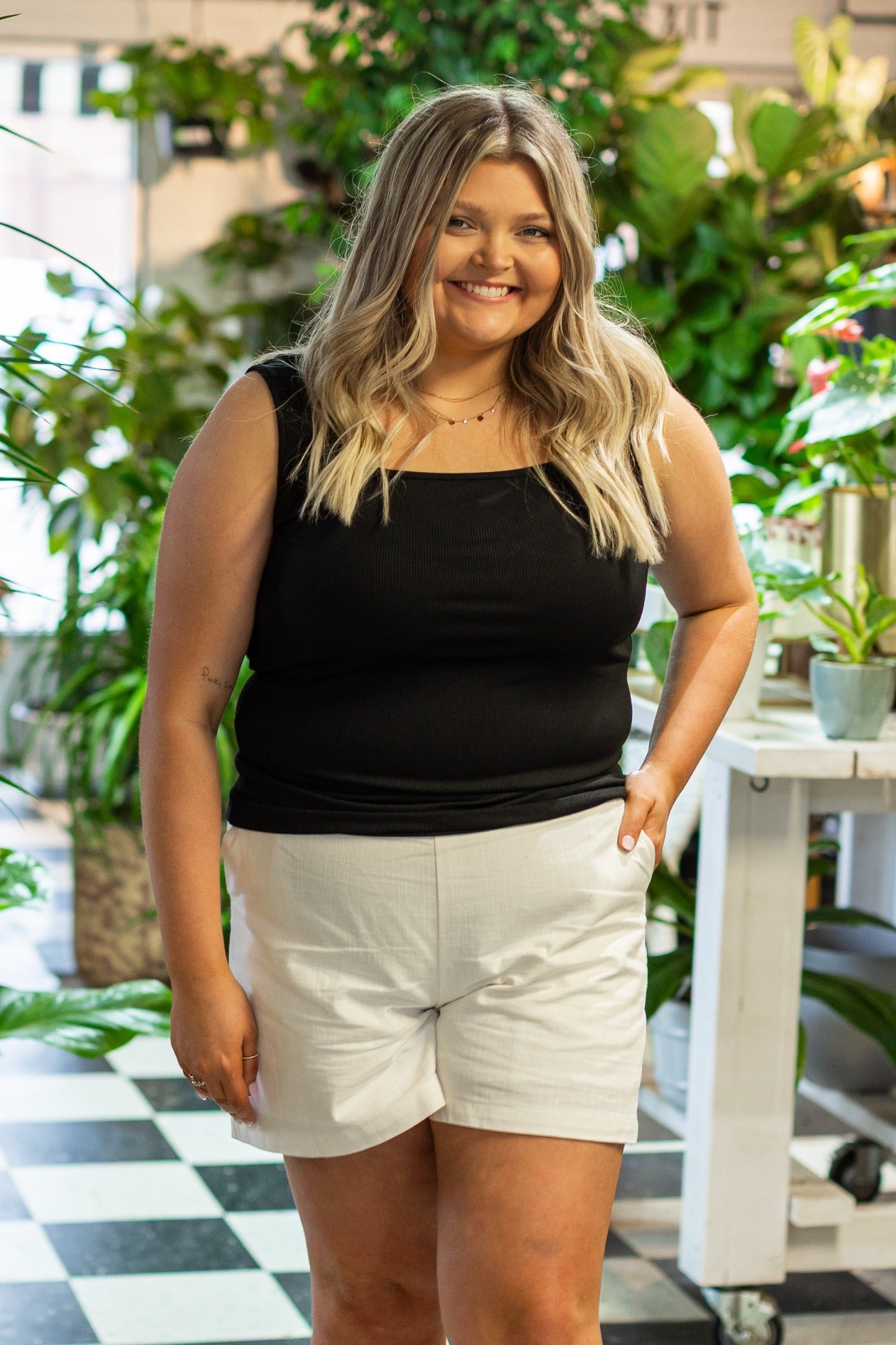 This rib knit tank top features a structured square neckline and a relaxed, mom crop fit that sits comfortably without clinging. Made with high-stretch fabric, it moves with the body while offering gentle support. The unlined finish keeps it lightweight and breathable—perfect for everyday ease with a soft, body-flattering silhouette.