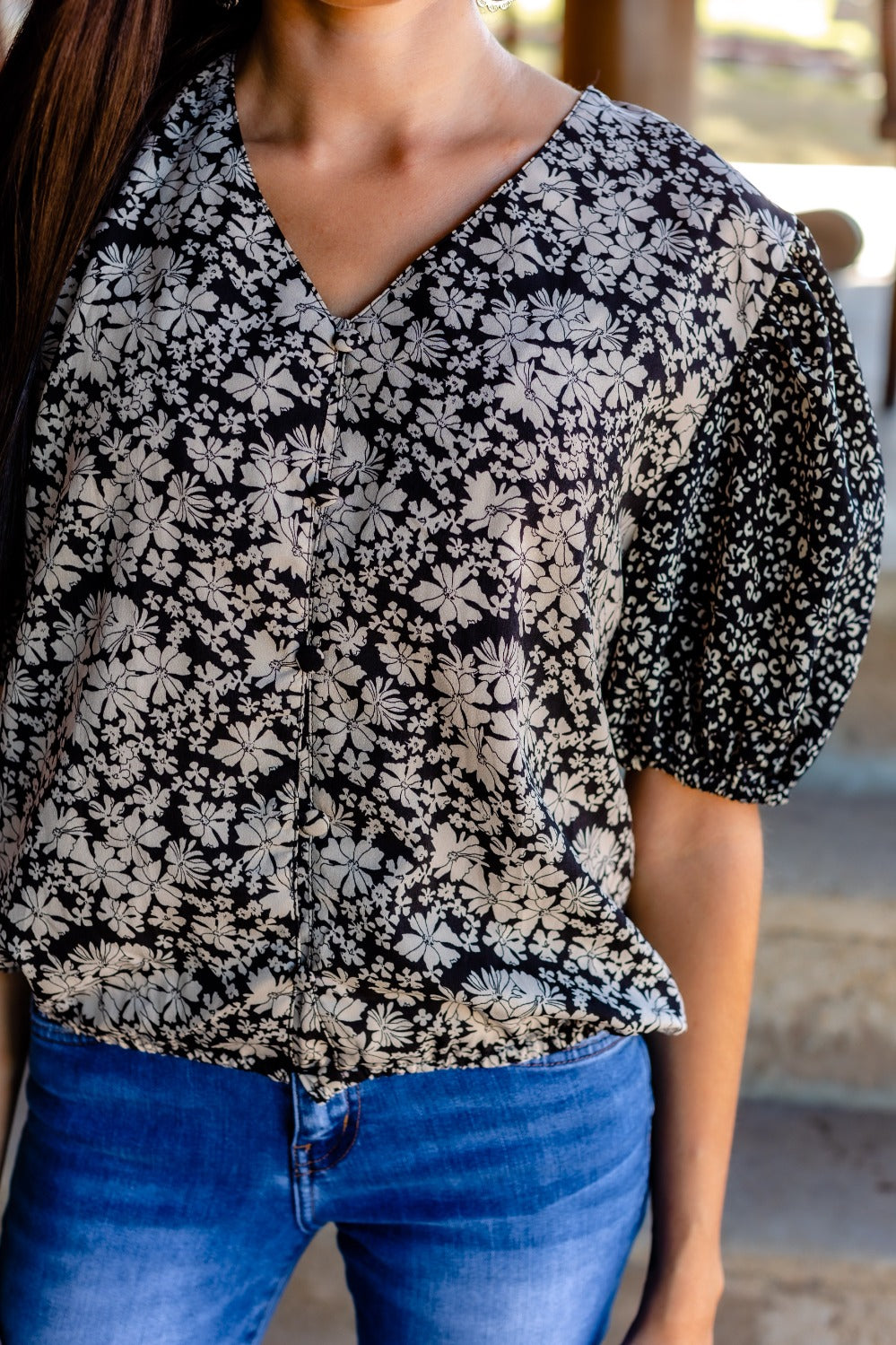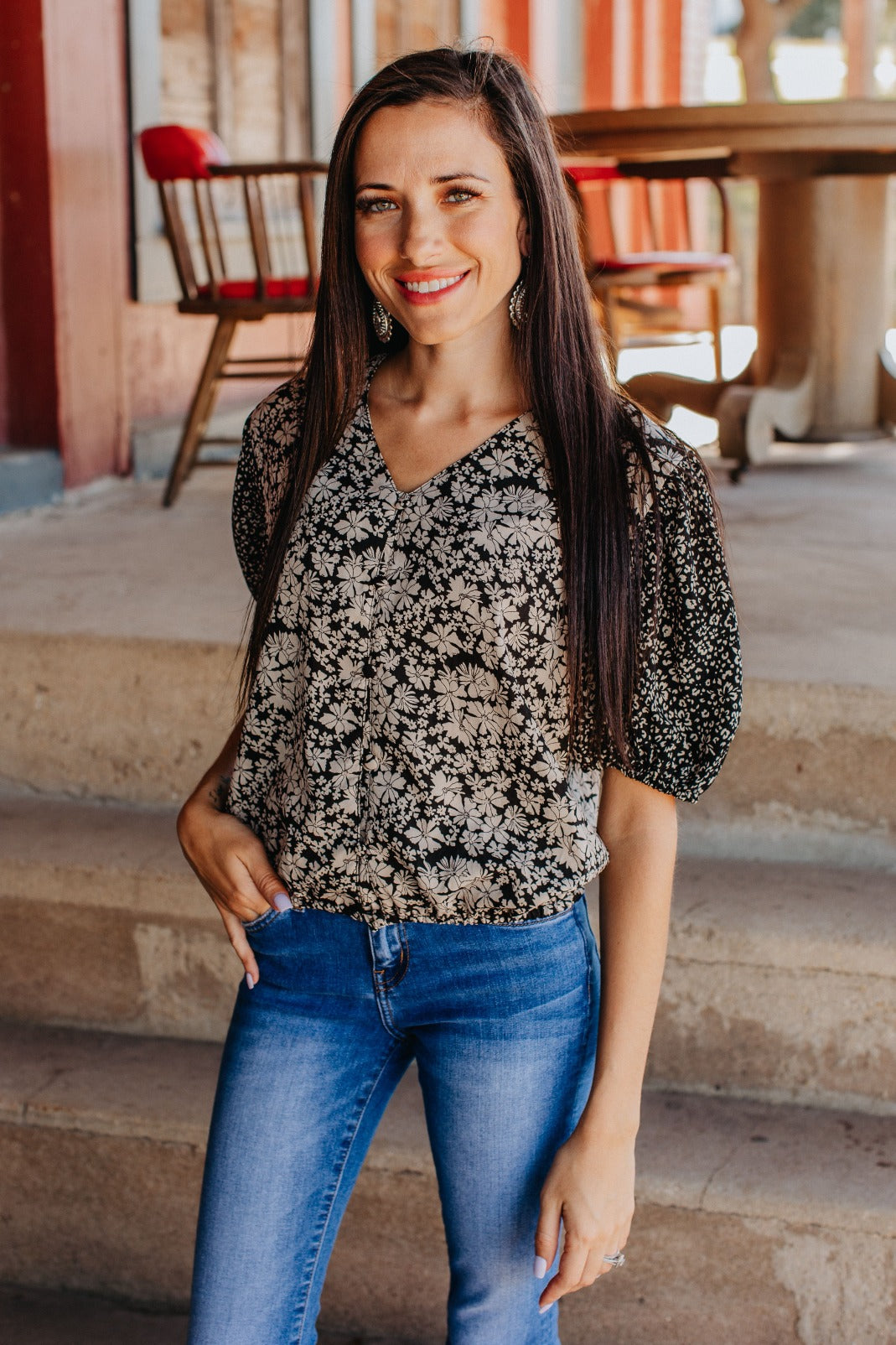 This long sleeve top can be styled in countless ways. The ‘Bountiful Blooms' blouse is lightweight fabric and is so comfortable, and the pattern on the sleeves add such a fun detail. Pair with your favorite jeans or a mini skirt for a cute, casual outfit.