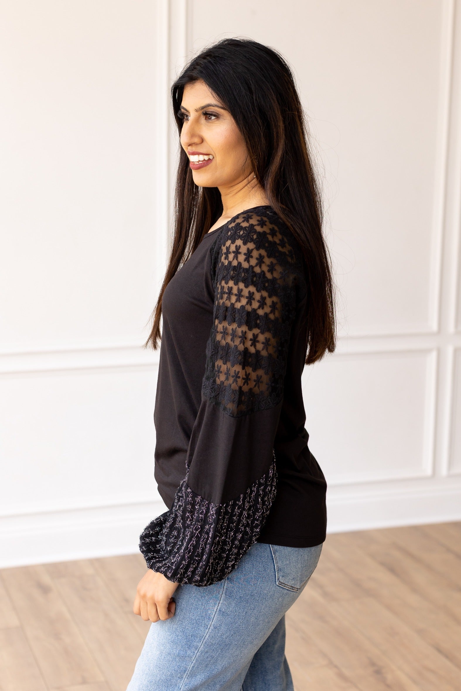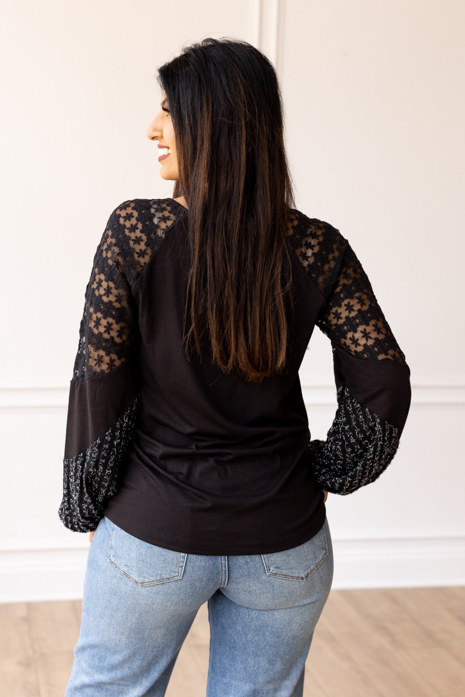 Embrace the allure of the "Enchanted Evening Black and Silver Lace Patch Sleeve Top" as you step into the night with confidence and grace. Let it be a testament to your unique sense of style and a beacon of elegance and beauty under the evening sky.