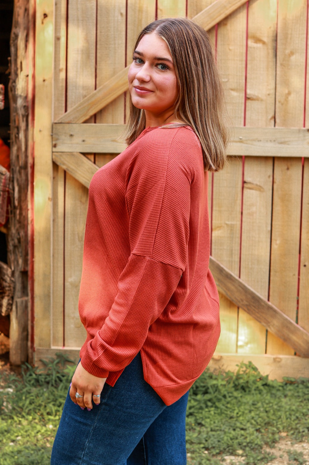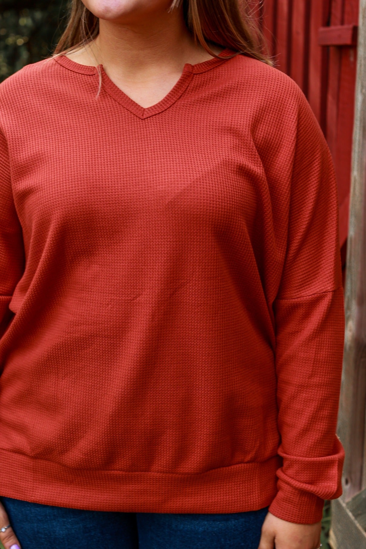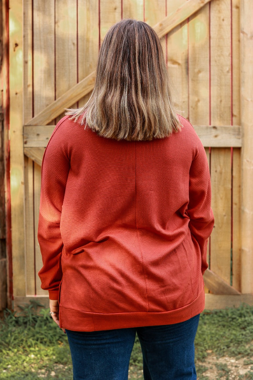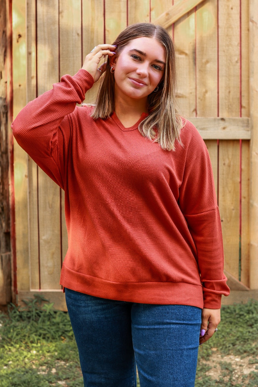 This adorable knit will be your staple blouse this fall! Our "On The Down Low Waffle Knit Top" in rust, is a must-have style with high-rise jeans or your favorite pair of leggings.