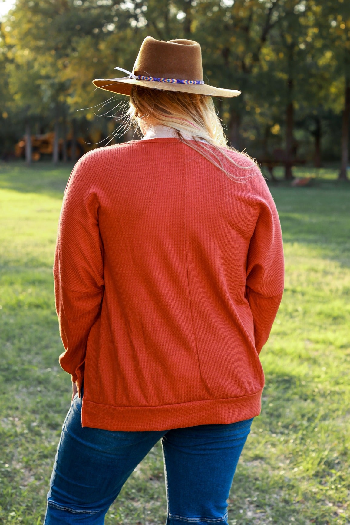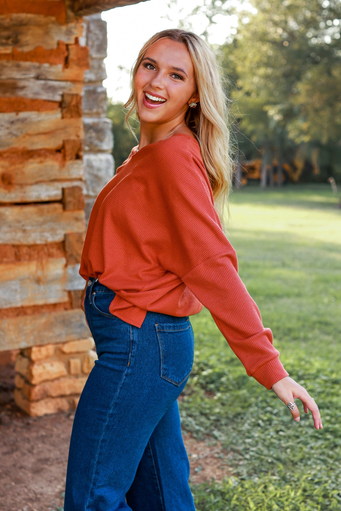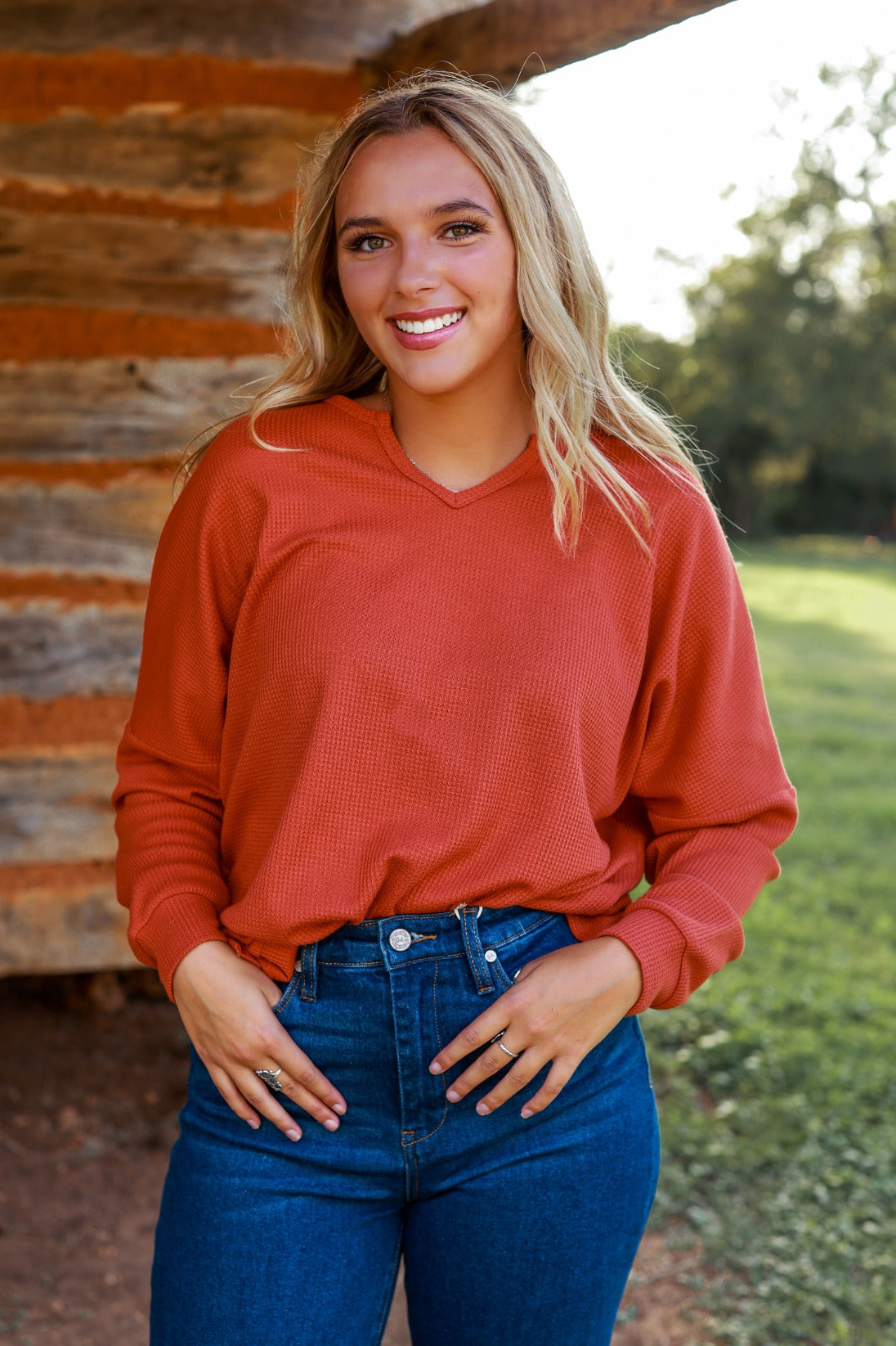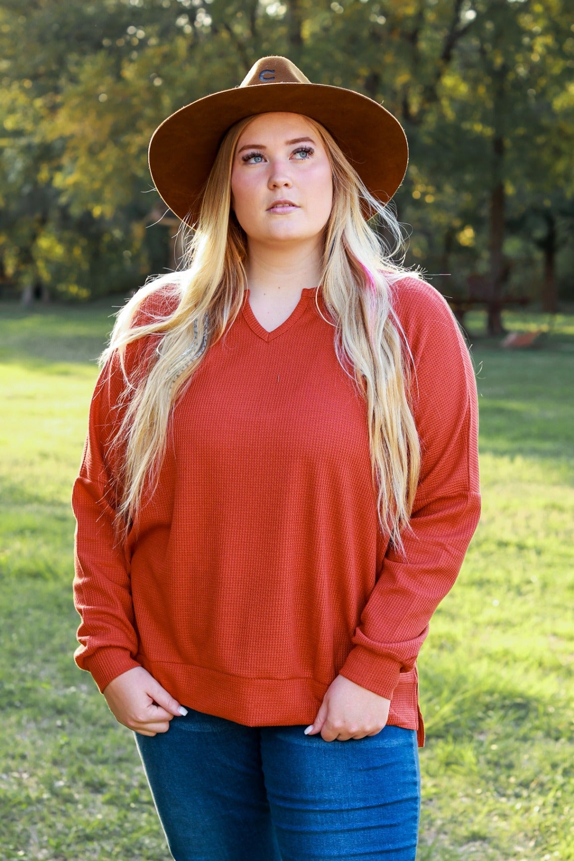 This adorable knit will be your staple blouse this fall! Our "On The Down Low Waffle Knit Top" in rust, is a must-have style with high-rise jeans or your favorite pair of leggings.