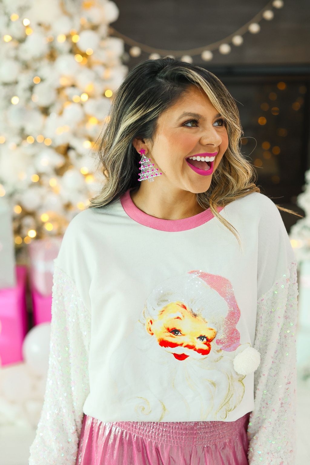 Get into the festive spirit with our best-selling Santa Claus White Sweatshirt! Featuring eye-catching sequin sleeves, this sweatshirt adds a touch of sparkle to your holiday wardrobe. Perfect for holiday parties, casual outings, or simply spreading cheer, this sweatshirt is a must-have for the season.
